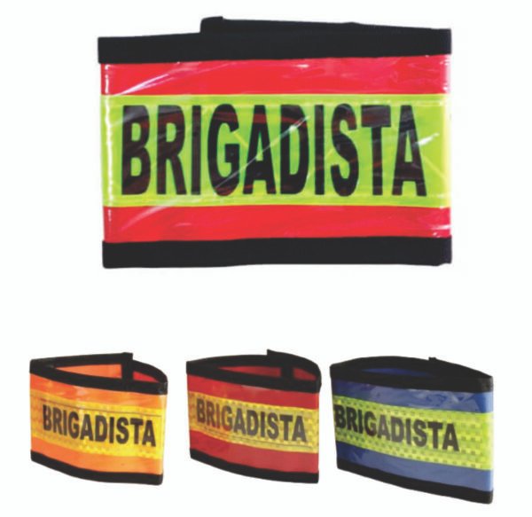 Brazalete brigadista, elaborado en lona y vinilo, con banda reflectiva. Cinta elástica negra graduable.
